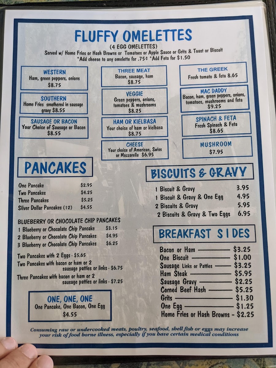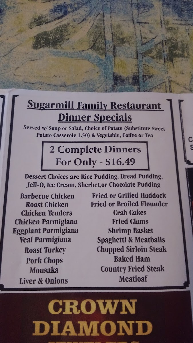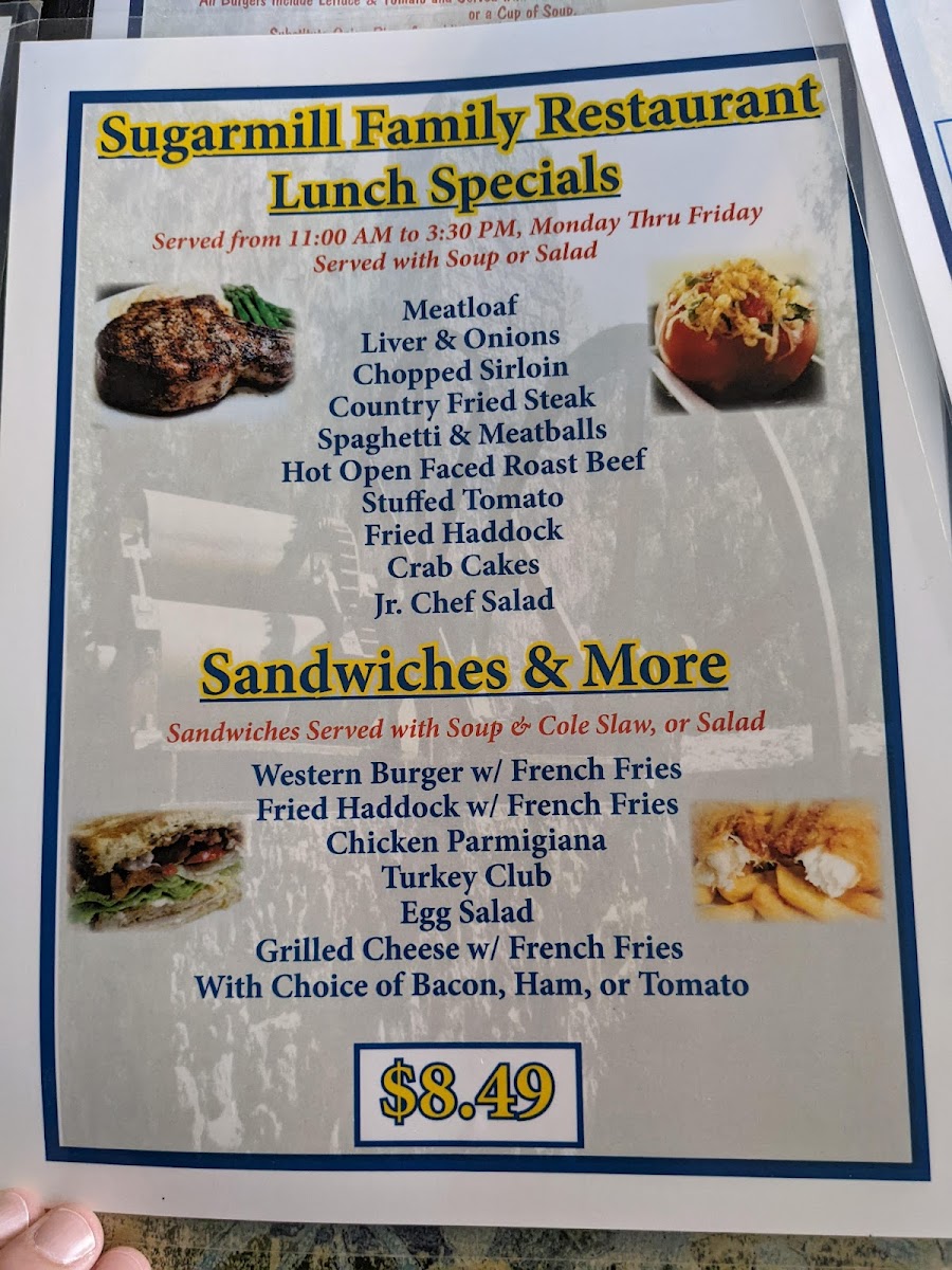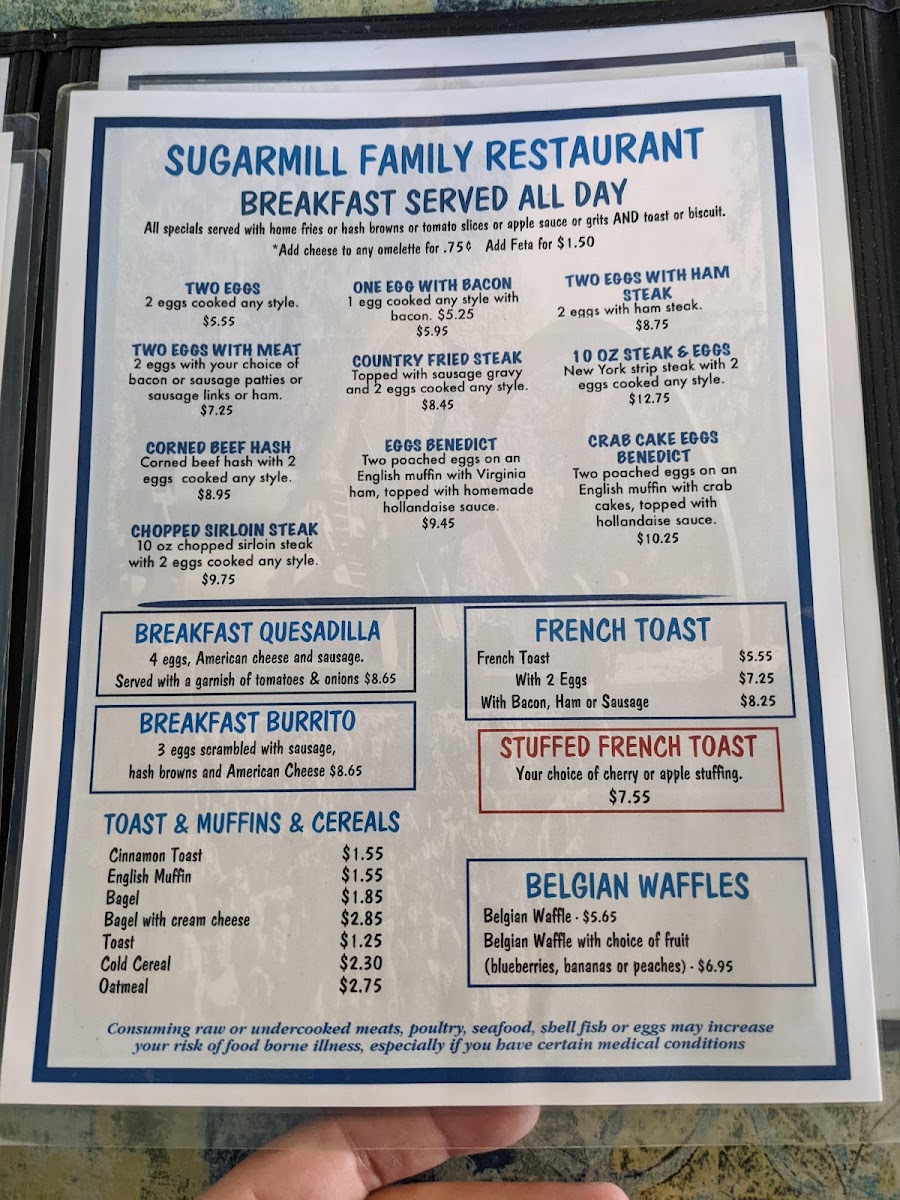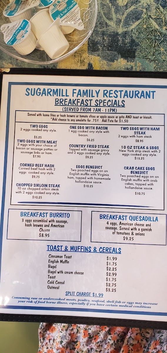 The menu at Sugarmill Restaurant offers a straightforward, comforting selection of classic American breakfast and lunch favorites. Designed with a relaxed, family-friendly atmosphere in mind, the dishes range from hearty omelets and fluffy blueberry pancakes to satisfying sandwiches and generous plates of fried fish or pork chops.